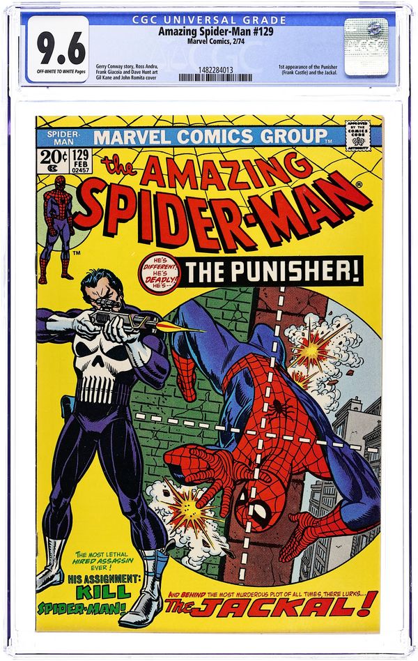 Collectors prize Amazing Spider-Man #129 not only for the Punisher’s debut but also for its striking cover art, which depicts Spider-Man crouched beneath a looming rooftop while the Punisher takes aim from above. The issue also includes the first appearance of the Jackal in costume, adding another layer of interest for comic historians. Printed during a period when comic preservation was not a priority, high-grade surviving copies are relatively scarce, especially examples that remain bright, intact, and free from spine wear or color fading.