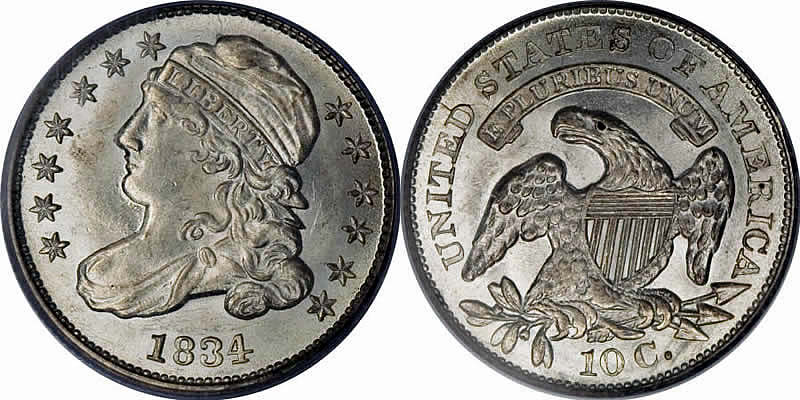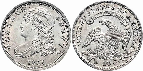 The reduced-size Capped Bust dime made its debut in 1828, coinciding with the presidency of Andrew Jackson, known as "Old Hickory." Its production continued for nine years, concluding shortly after excessive speculation triggered the financial Panic of 1837, leading to a collapse in real estate, stock, and commodity prices. The total mintage during this period amounted to approximately 6,730,000 dimes. Small quantities of proofs are known for each year. Like many coins of its time, there are intriguing varieties among Capped Bust dimes. Notable examples include the 1830/29 overdate and the 1829 with the curled base '2.' However, contemporary collectors of variety coins are relatively few. As coins have become more expensive and widely dispersed over the years, only a handful of collectors pursue date sets of Bust dimes, let alone variety collections. Most opt for owning a representative type specimen. While circulated examples are readily available for every year, finding this design type in high grades above Mint State 64 can be quite challenging. Nevertheless, small quantities of exceptionally well-preserved pieces do exist, some grading as high as MS 67. Among the scarcer dates in high grade are the 1828 Small Date, 1830/29, and 1837.