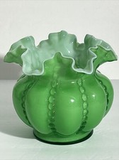 Vintage FENTON Green Beaded Melon Ruffled Overlay Rose Bowl Vase 3.75"T x 4.5"W