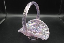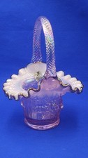 Fenton Art Glass Pink Opalescent Mini Basket Applied Twisted Handle Ruffled Rim
