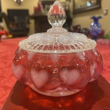 Gorgeous Fenton Cranberry Opalescent Heart Optic Powder Jar. Beaded Lid-Ex Cond