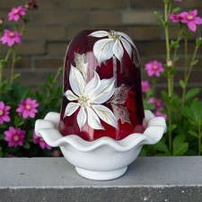 Fenton Art Glass White Poinsettia Ruby Fairy Lamp Hand Painted Vintage Decor