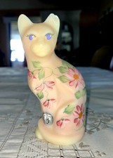 Vintage Fenton Art Glass Cat Opalescent Hand Painted Flowers Signed By Artist