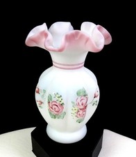 Fenton Glass Vase Mossy Rose White Satin Cranberry W Floral 7.5"