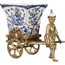 Bronze Ormolu Rickshaw Man With Porcelain Blue And White Planter Pot 12"H