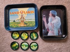 VINTAGE COCA COLA AND LAND O' LAKES METAL SERVING TRAYS W/ 6 COCA COLA COASTERS