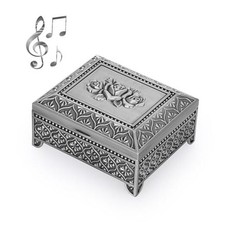 Vintage Music Box Metal Musical Jewelry Box Keepsake Box, Rose Pattern Silver