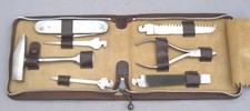 ANTIQUE/VTG CAMPING TOOL SET~STEEL~7 TOOLS~FOLDING KNIFE~BROWN VINYL CASE