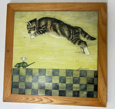 9.5" 1982 Lowell Herrero Framed Tile Art Cat Pouncing Toy Mouse Vintage Japan