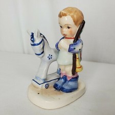 Vintage Little Boy Toy Horse Porcelain Figure Red Head 4.25" Nursery Decor Japan