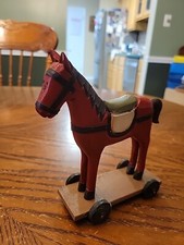 Vintage Wooden Horse TOY Figure Statue on Wheels Red-Brown 6" Tall 6" Wide