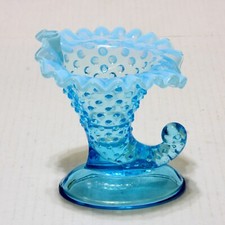 Fenton Vase Hobnail Blue Opalescent Glass Ruffled Edge Horn Of Plenty Vintage