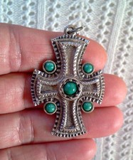 MALACHITE GLASS CROSS PENDANT-ANTIQUE SILVER PLATE MADE IN CZECH