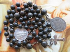 Late 1800 Antique Round Black Wood Beads Rosary-Miraculous & Sacred Heart Medals