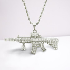 NEW Silver Machine Gun Bling Pendant W/36” Chain BIG Hip Hop Ar15 Ak47 2.5” Long