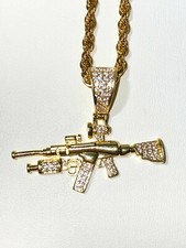 Men's 14k Gold Iced Ice out Gun Riffle Ak 47 Pistol Charm Pendant Rope Necklace