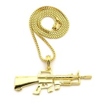 Mens 14k Gold Finish Iced Gun Premeth Riffle Ak 47 Charm Pendant Rope Necklace