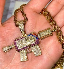 Men's Women Iced 14k Gold Finish AK-47 Icy Gun Pendant Charm Rope Chain Icy