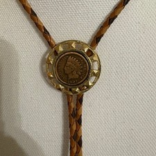 Vintage Braided Leather Bolo Tie Indian Head Penny Bolo Slide Antique Pennies