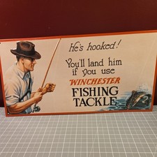 ~VTG.~ "HE'S HOOKED WINCHESTER FISHING" METAL ADVERTISING SIGN 8" X 14 1/4"