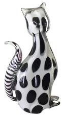 Art Glass Cat White & Black Polka Dot & Stripes Encased in Clear Glass 9.5"
