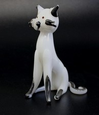 Vintage Hand Made Lampwork GLASS Black and White Feathered CAT FIGURINE