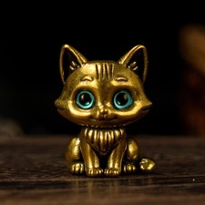 Vintage Solid Brass Cat Statue with Bule Eyes Elegant Retro Desk Toy & Collec...