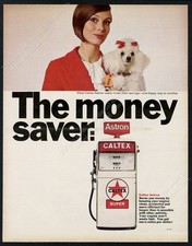 1968 woman toy & poodle photo Caltex gas pump Texaco vintage print ad