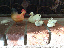 5 VINTAGE 1950S 4 SWANS 1 ROOSTER PLASTIC TOYS/DECOR