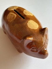 Antique Stoneware Pottery Piggy Bank Pig Brown Tan Sopts Hand Made Pottery 6”
