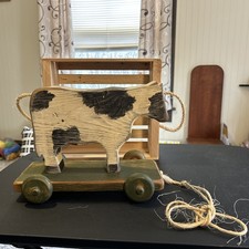 Vintage Wolf Creek Wooden COW Animal Toy With Wheels Primitive Folk Art Decor