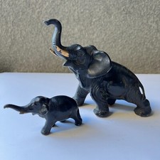 Antique Vintage Metal / Cast Iron Elephant mother and baby with tusks, trunk up