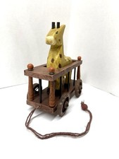 Vintage Hand Carved Painted Wooden Giraffe & Wagon Pull Toy Decoration