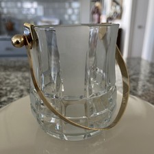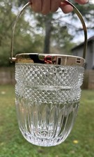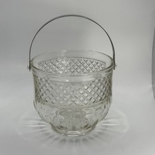 Vintage Faceted Glass Ice Bucket Handle Mid Century Heavy Paneled Barware Wine