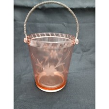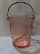 VINTAGE PINK DEPRESSION GLASS ICE BUCKET W/ETCHED FLOWER & METAL HANDLE