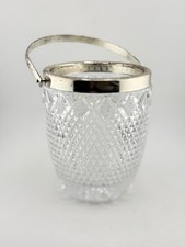 Vintage Cut Diamond Crystal Glass Ice Bucket Silver Plated Handle Rim Heavy 6"