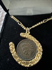 1903 Indian Head Penny Horseshoe Pendant w/Rhinestones Goldtone Necklace Unisex