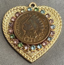 1905 Indian Head Penny Coin Heart and Crystal Pendant
