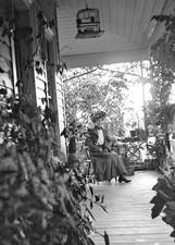 ANTIQUE GLASS PHOTO NEGATIVE - WOMAN IN A HAT WITH HER PLANTS AND BIRDCAGE
