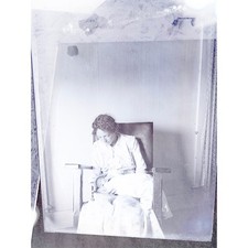 Vintage GLASS NEGATIVE Slide Photo antique LADY white dress Chair Holding Paper