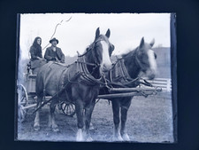 Vintage GLASS NEGATIVE Slide Photo antique HORSES WAGON Lady Man