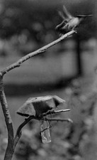 ANTIQUE GLASS PHOTO NEGATIVE: HUMMINGBIRD PERCHED NEAR GLASS FEEDER