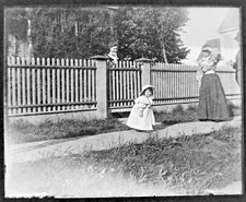Vintage GLASS NEGATIVE Slide Photo BOY Petting DOG Ladies Hat Fence Post antique