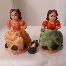 Vintage 3.25" Hard Plastic Lady Spool String Pull Toy Doll Red Blue Dress Italy