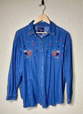 Vintage Let’s Quizz Again Denim Shirt XL Teddy Bears Hearts Flag Embroidered
