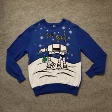 Star Wars Men Winter Sweater Large Blue AT-AT Walker & Tie Fighters Stretch *