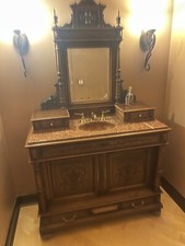 Rare Antique French Victorian Mahogany Marble Top Bathroom Vanity Porcelain Sink