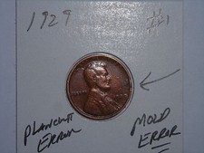 1929 MOULD MARK ,NICE PLANCHET ERROR 1929-P LINCOLN CENT LOT #1 LAMINATED ERROR