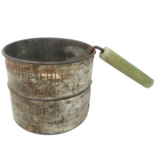 Antique One Cup Two Cup Tin Flour Sifter with Green Wood Handle