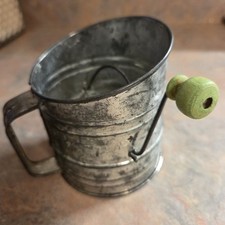Vintage 50s Workable Toy 1 Cup Tin Metal Flour Sifter w/GREEN Knob Handle